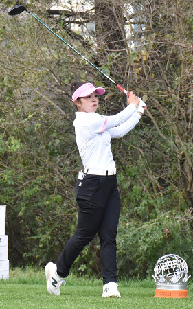 米女子ゴルフの国・地域別対抗戦、ハンファライフプラス・インターナショナル・クラウンの1次リーグ初戦。B組の日本は世界選抜と対戦して1分け1敗だった。写真は、ティーショットを打つ山下美夢有=23日、韓国 【時事通信社】