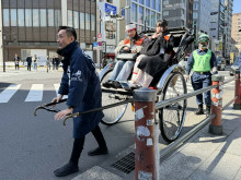 午前10時に「これは訓練です。地震が発生しました」とアナウンスがあると、外国人観光客役の留学生20人と各町会から参加者は一斉に体勢を低くした。5分後には、一時滞在施設となる浅草文化観光センターへと移動。その間、雷門交番前のスピーカーから、韓国語・中国語・英語・ベトナム語・タイ語によるアナウンスが流された。併せて、要救護者2人を病院へ運ぶため、人力車に乗せて搬送する訓練も行われた。