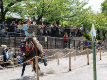「浅草流鏑馬(やぶさめ)」が4月18日、隅田公園(台東区花川戸1)で、国内外から多くの観光客が見守る中で開催された。主催は台東区。