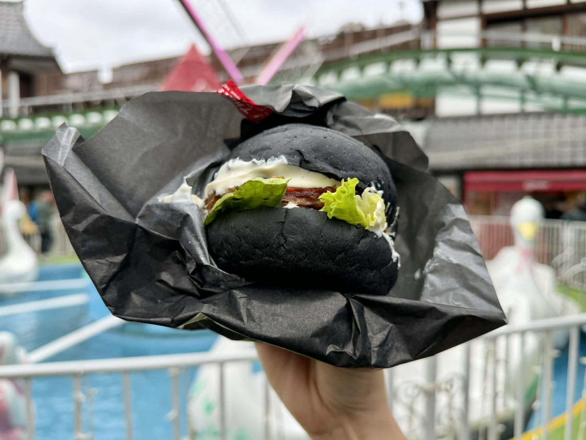 ドムドム×花やしき2026:スワンをバックにパンダカーバーガー