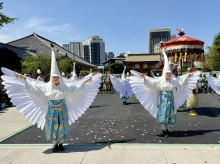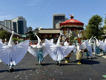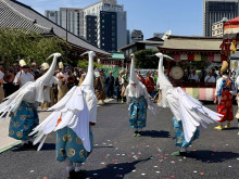 浅草寺(台東区浅草2)で4月12日、「白鷺(しらさぎ)の舞」が多数の訪日観光客や日本人観光客がカメラを構える中で奉演された。