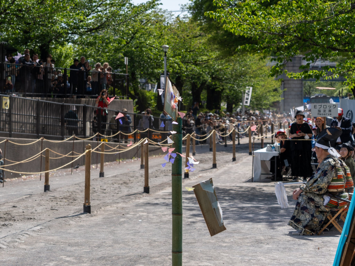 「浅草流鏑馬(やぶさめ)」が4月18日、隅田公園(台東区花川戸1)で、国内外から多くの観光客が見守る中で開催された。