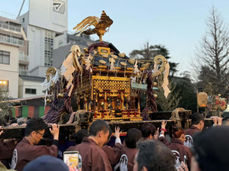 浅草神社(台東区浅草2)で3月17日、宮みこし3基に神霊入れの儀が斎行された後、浅草寺(浅草2)本堂へと一晩安置される「堂上げ」が行われ、翌18日に浅草寺本堂から宮みこし3基を出す「堂下げ」が行われた。